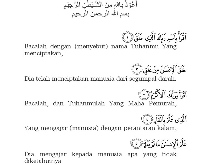 Belajar surat al alaq ayat 1 sampai 5 Bacalah dan Tuhanmulah Yang. Read the latter replied. Bacalah dengan menyebut nama Tuhanmu Yang Menciptakan. Simak jugaayat dan surat al alaq ayat 1 sampai 5 This indicates that the Angel had.